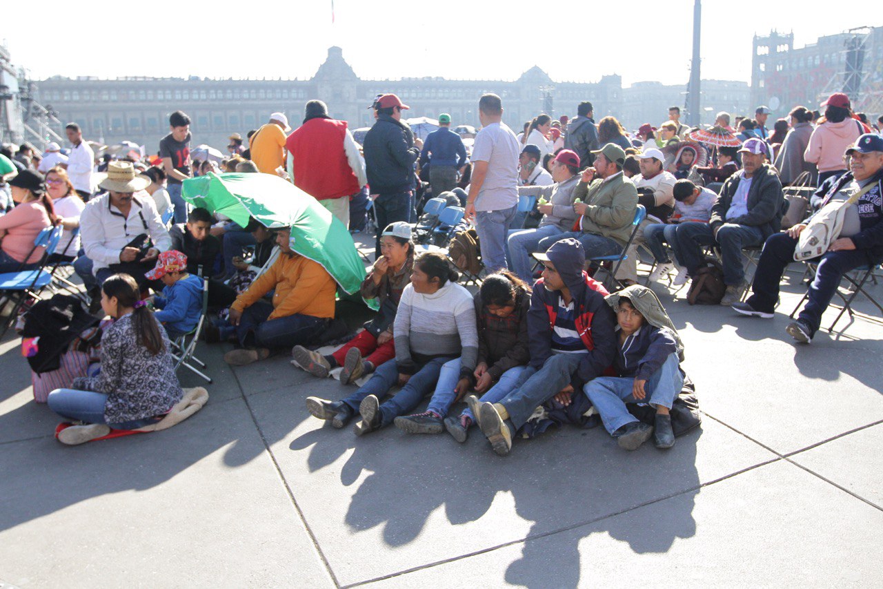 Otros grupos del partido Morena han arribaron con la ya clásica “Es un honor estar con Obrador”, y ciudadanos a pie buscan un lugar para presenciar el evento alejados del ya quemante sol decembrino.