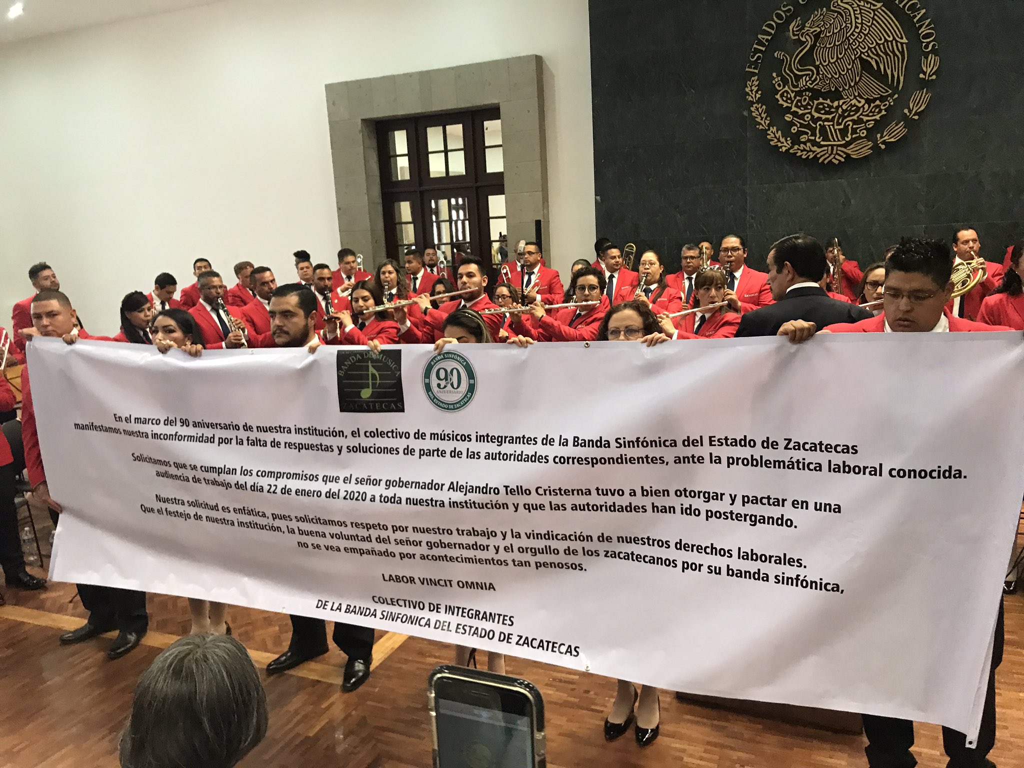 En el marco de un concierto que se llevaría a cabo en Los Pinos con motivo del 90 aniversario de la Banda de Música de Zacatecas, los integrantes de la misma se manifestaron para denunciar incunplimientos laborales por parte del gobierno de Alejandro Tello.