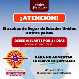En el caso de Fresnillo, se ha emitido un comunicado, en el que exhorta a los visitantes procedentes de los Estados Unidos, durante estas fechas, que al llegar se aíslen en los lugares a donde llegue, por lo menos 14 días, para prevenir contagios.