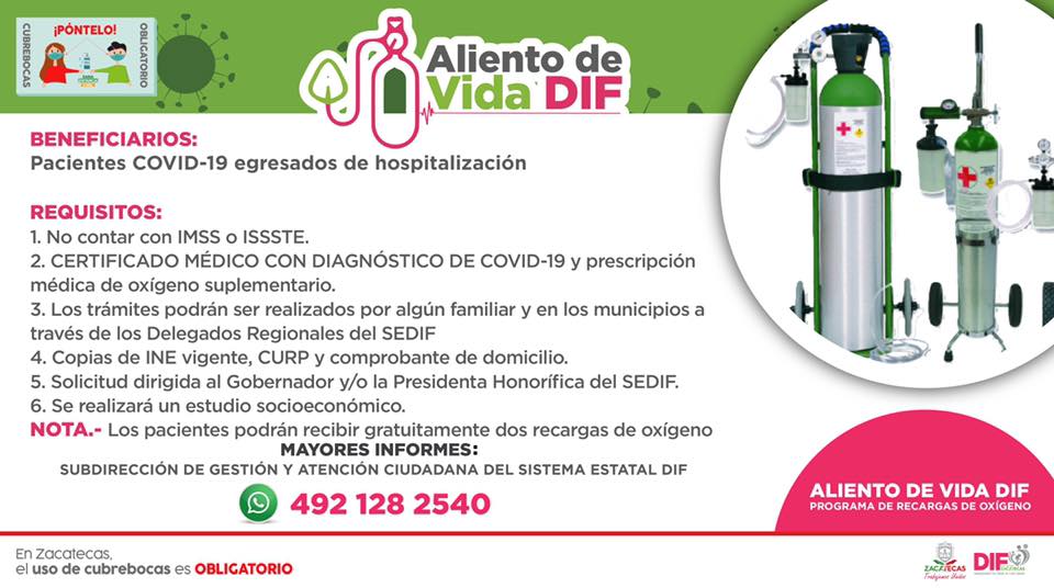 Debido a que 90 por ciento de los pacientes dados de alta requiere oxígeno suplementario para seguir su recuperación, mediante Aliento de Vida DIF se cubre el gasto de dos recargas de tanques de oxígeno para los egresados de la UNEME-COVID de Zacatecas, a fin de que puedan seguir su recuperación en casa.