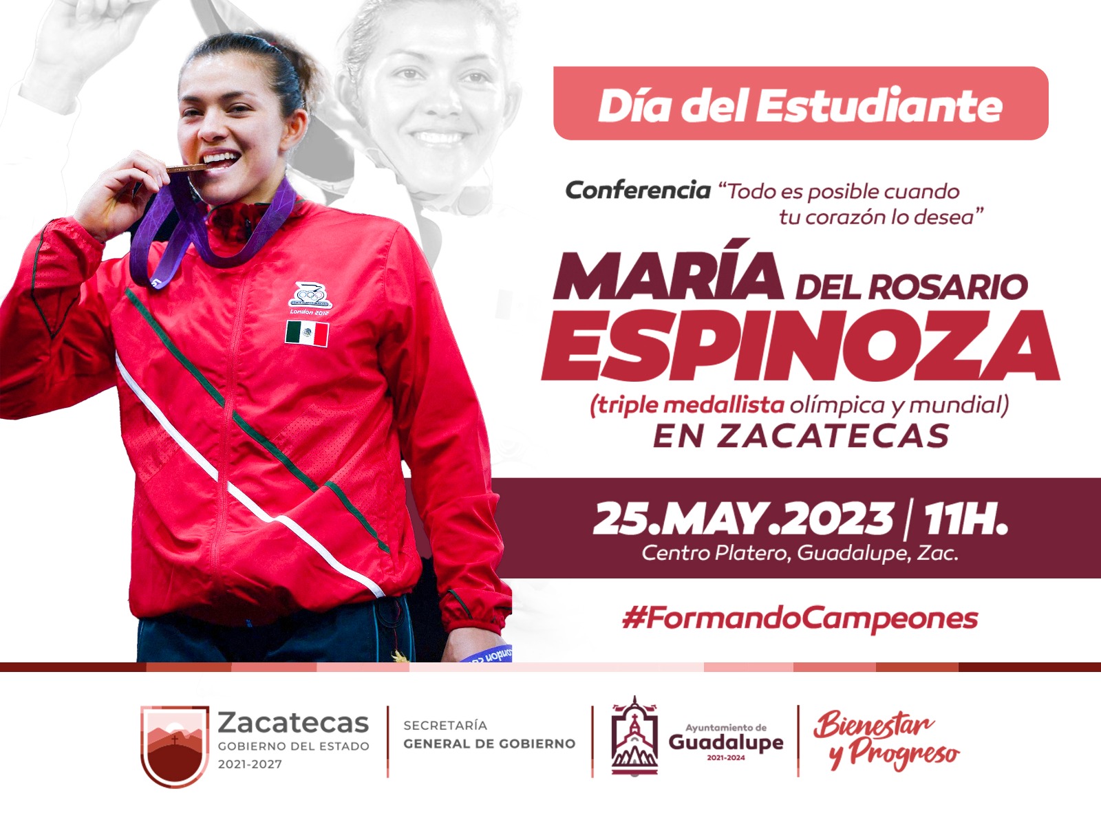 El Ayuntamiento de Guadalupe, que preside José Saldívar Alcalde, organiza este jueves 25 de mayo, la conferencia de la atleta de Tae Kwon Do, María del Rosario Espinoza, triple medallista olímpica, en el marco de las actividades del Día del Estudiante.