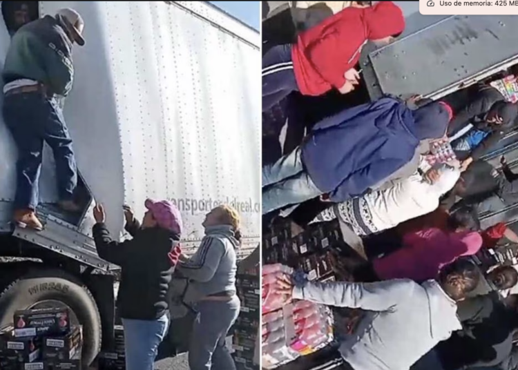 Los pobladores saquearon por completo la caja de un tráiler que trasladaba cajas de alimentos y bebidas.