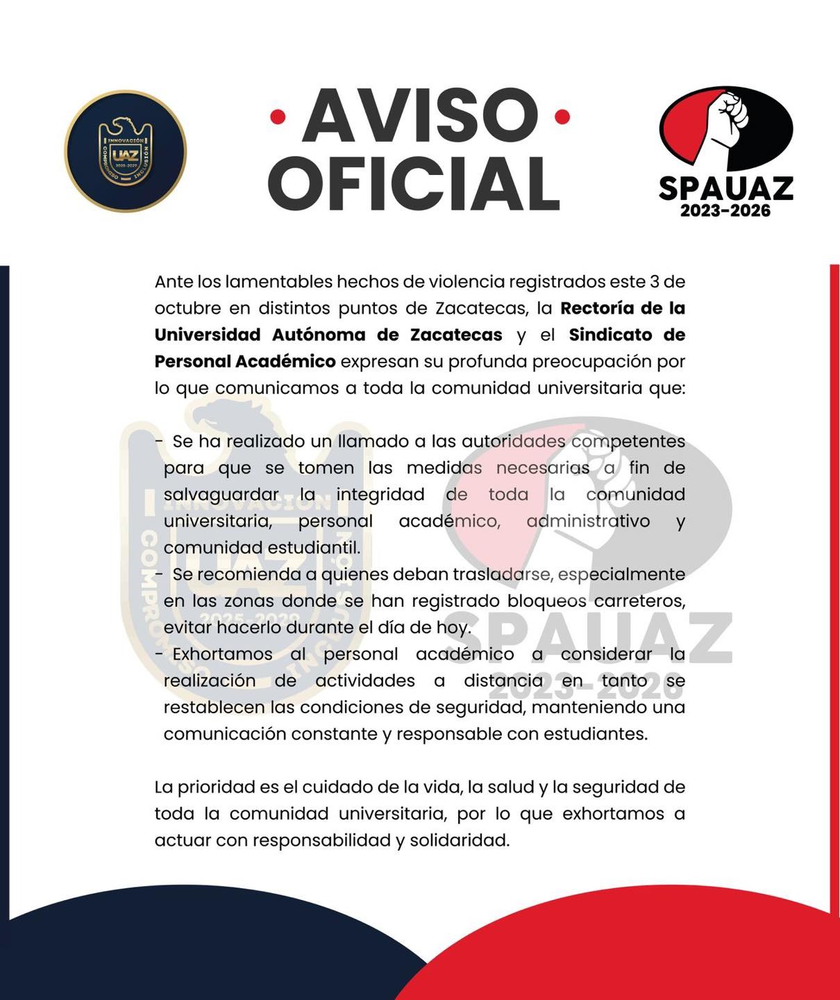 La Rectoría de la Universidad Autónoma de Zacatecas y el Sindicato de Personal Académico (Spauaz) solicitaron a las autoridades competentes, se tomen las medidas necesarias para salvaguardar la integridad de la comunidad universitaria (docentes, estudiantes y trabajadores), ante los hechos violentos generados esta madrugada en distintos municipios del estado.