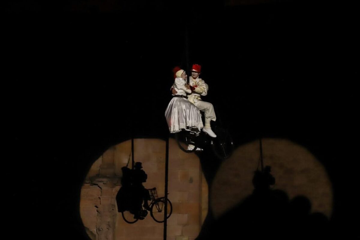 En “Pedaleando hacia el Cielo”, los ángeles suspendidos en bicicletas aéreas relataron, a  miles de personas congregadas en Plaza de Armas, una historia de amor que desafió la oscuridad y la tristeza, y que elevó al público la fuerza simbólica de los sentimientos que esta noche les unieron.