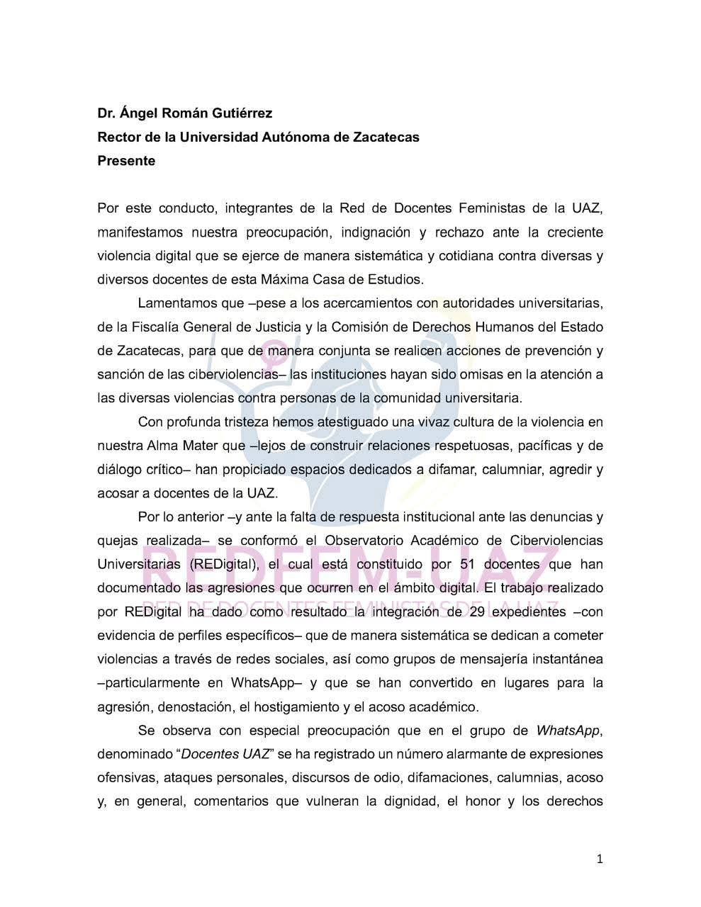 En el escrito las integrantes del movimiento expresan que en el grupo de WhatsApp “Docentes UAZ” se han registrado un número “alarmante de expresiones ofensivas, ataques personales, discursos de odio, difamaciones, calumnias, acoso”.