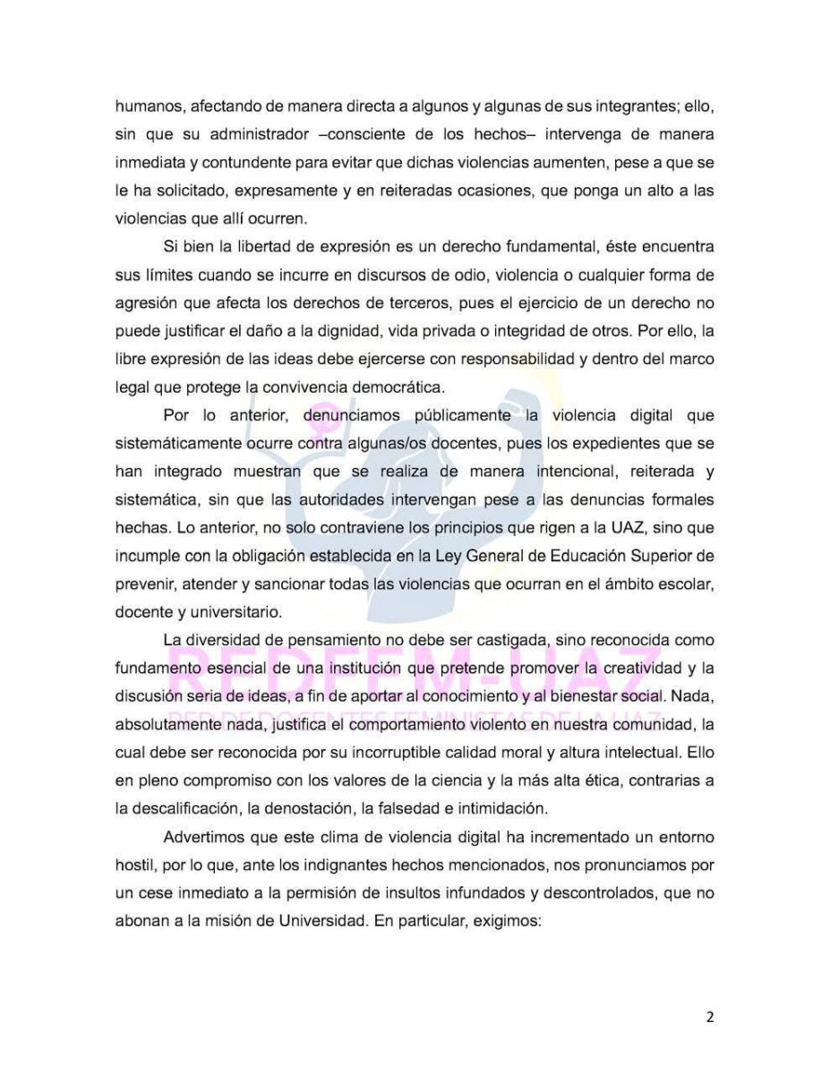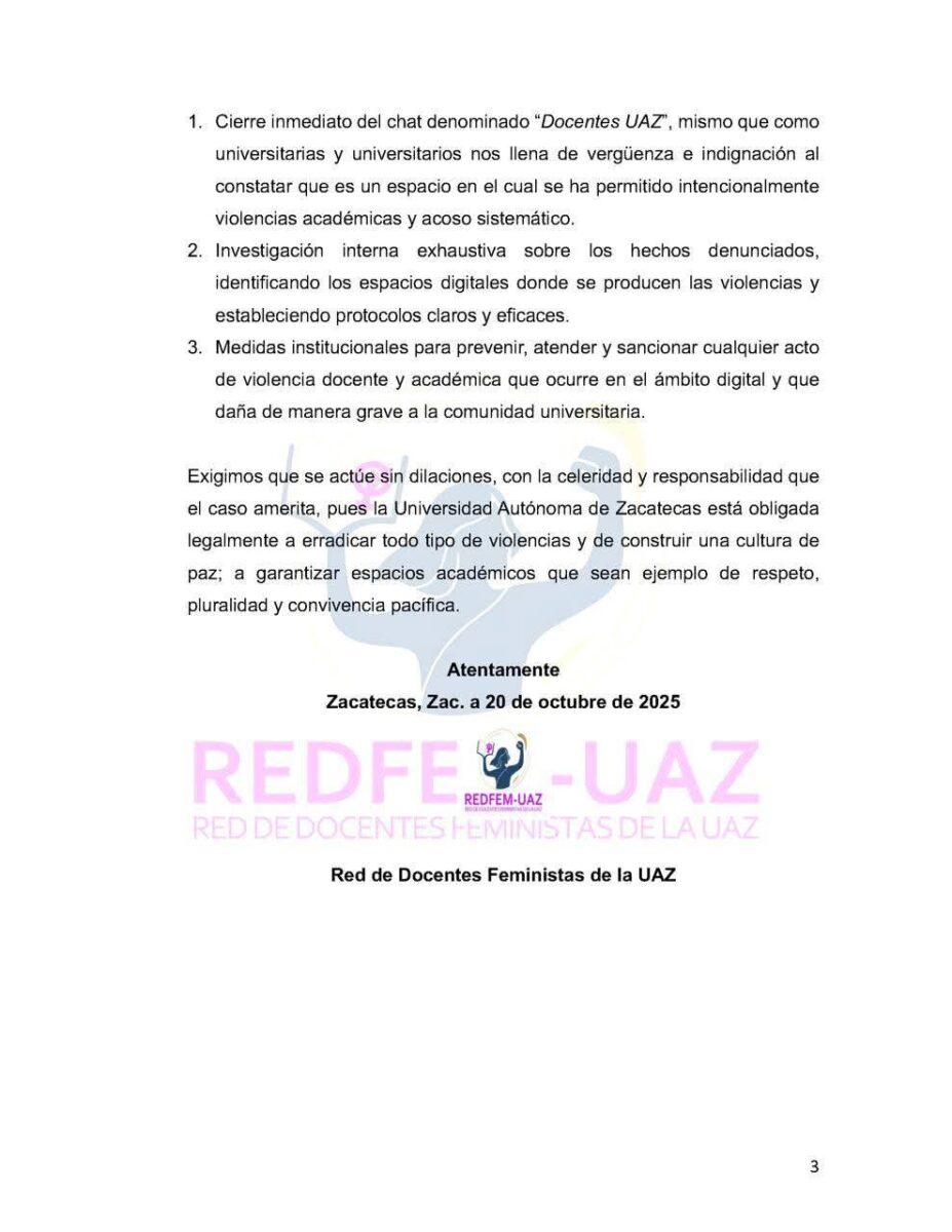 A través de un comunicado publicado en redes sociales las Docentes Feministas de la UAZ exigen el cierre inmediato del chat denominado “Docentes UAZ” el cual “nos llena de vergüenza e indignación al constatar que es un espacio en el cual, se ha permitido intencionalmente violencias académicas y acoso sistemático”.