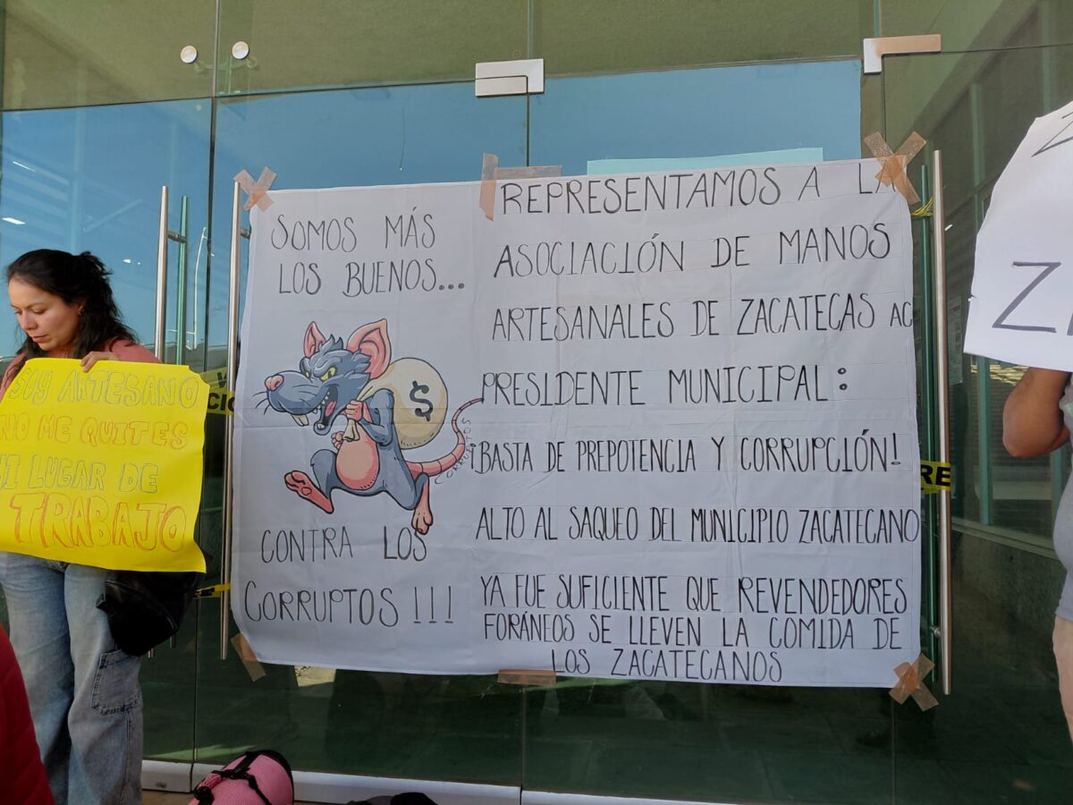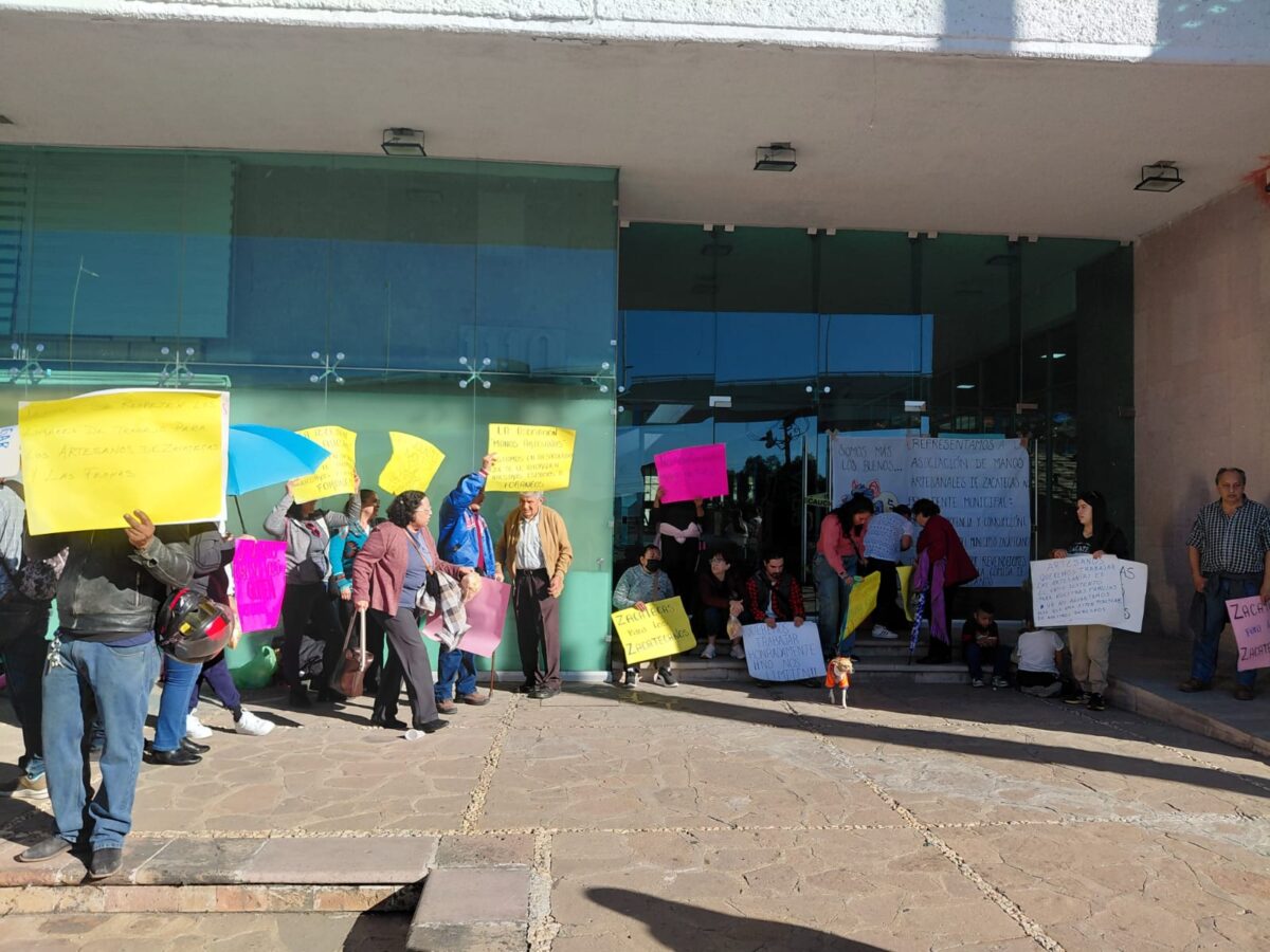 ZACATECAS. – Bajo la exigencia de que no se otorguen permisos a comerciantes foráneos y se le de prioridad a los artesanos locales, para ofrecer sus productos en el centro histórico de la capital, la organización Manos Artesanales bloquearon las instalaciones de la presidencia municipal de la capital.