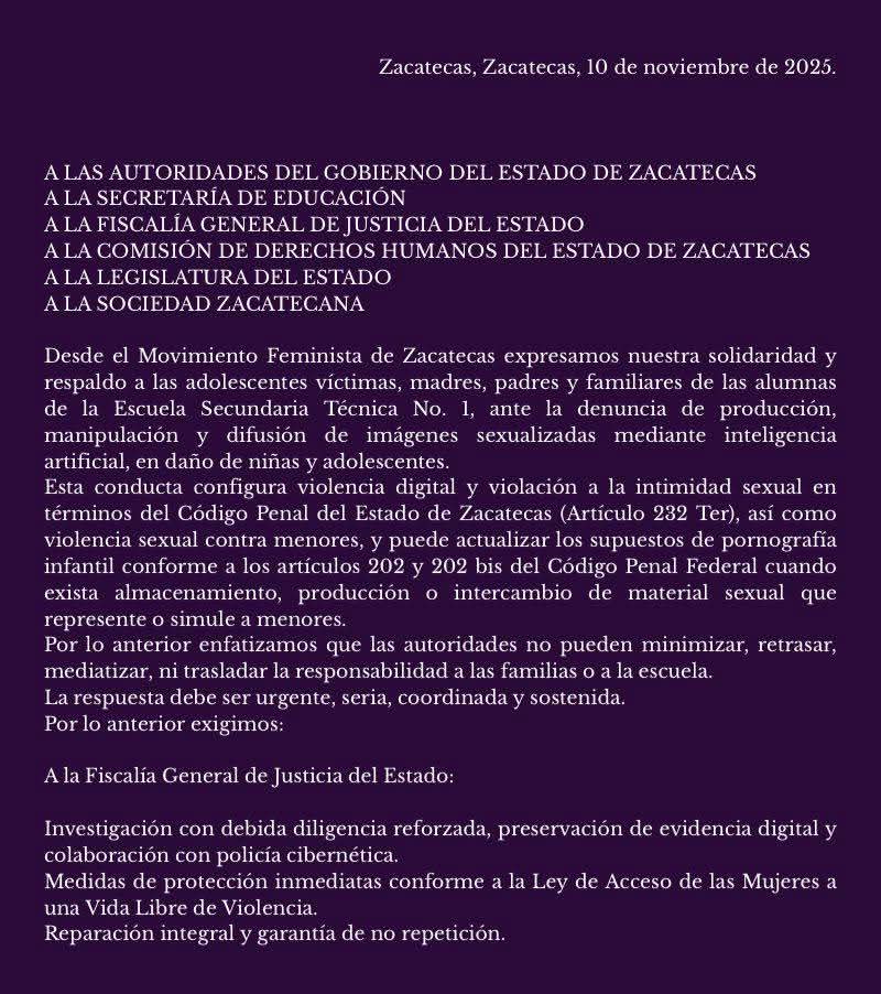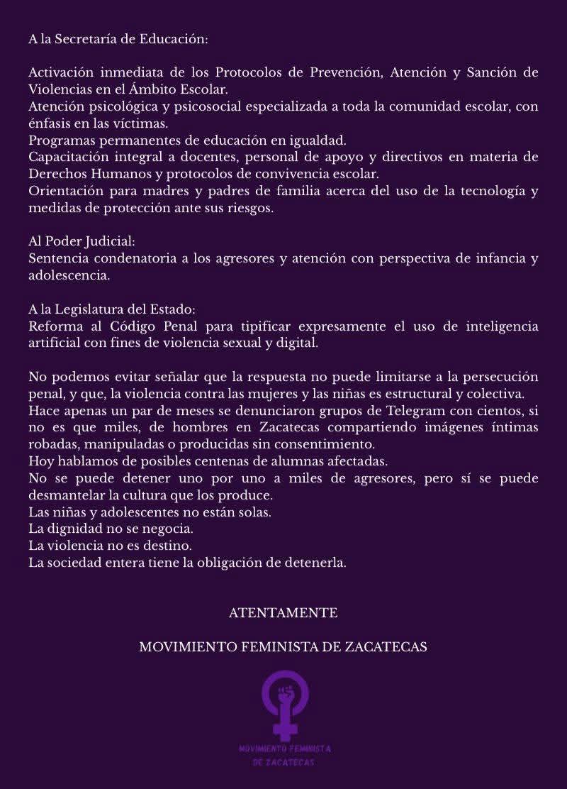 El movimiento exige a las autoridades “no minimizar, retrasar, mediátizar, ni trasladar la responsabilidad a la familia o a la escuela”, argumentando que se trata de un caso de atención urgente, por lo que se exige a la Fiscalía General del Estado de Zacatecas (FGJEZ) realizar la investigación correspondiente, la preservación de evidencia digital y colaboración con policía cibernetica.