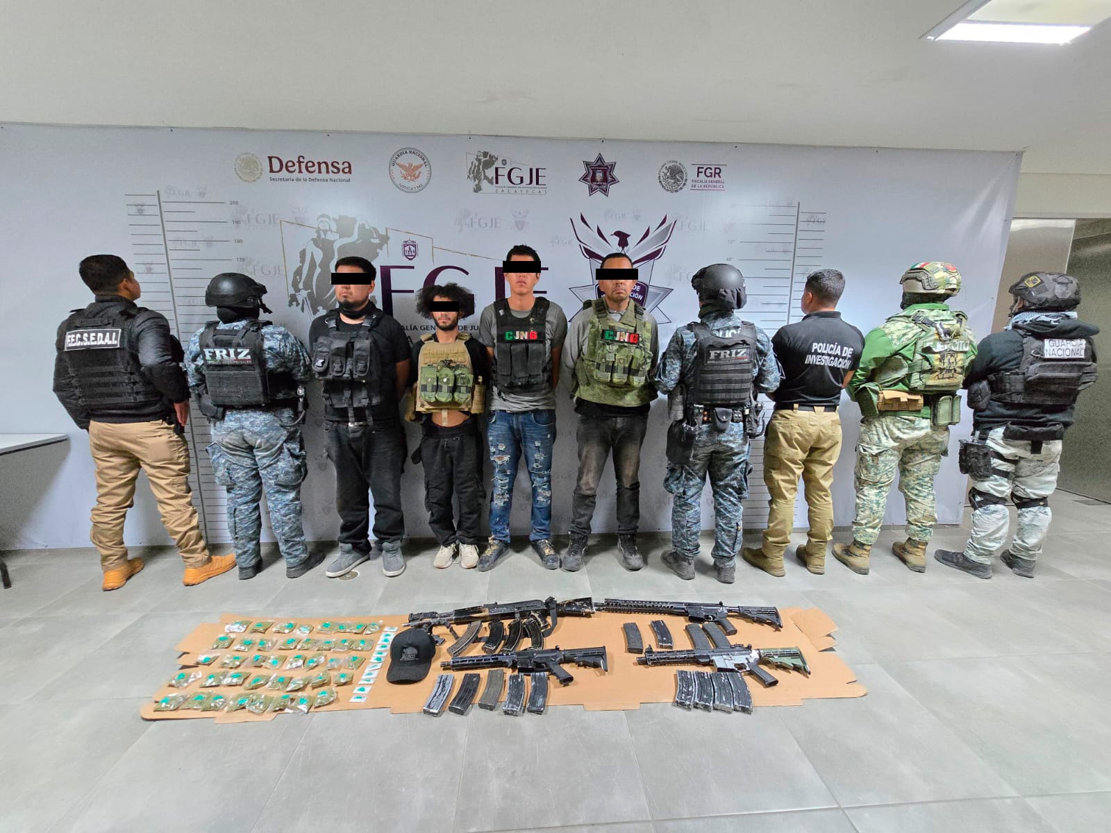 Tabasco, Zac.– Luego de una agresión armada, elementos de las Fuerzas de Reacción Inmediata Zacatecas (FRIZ) detuvieron a cuatro civiles integranres del Cártel Jalisco Nueva Generación y confiscaron armamento en la comunidad del Aguacate de este municipio, acción en la que participaron fuerzas de seguridad de los tres órdenes de gobierno.