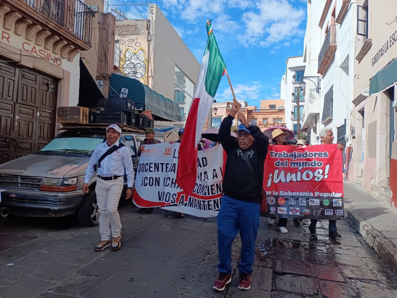 A esta marcha se unió el Sindicato Único de Trabajadores de Universidad Tecnológica del Estado de Zacatecas (Sututez) quien cumple 15 dias de paro de labores, en demanda del incremento salarial del 4 por ciento y del 2 por ciento en prestaciones, que no se le ha proporcionado por parte del gobierno del estado.
