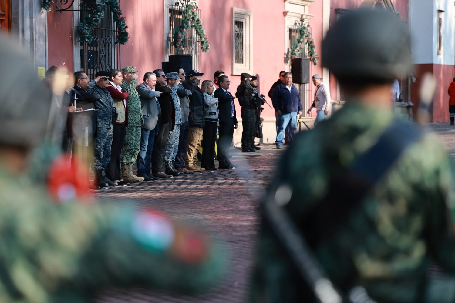 Tuvieron participación en el evento el Coordinador de la Guardia Nacional, Vicente Dimayuga Canales; el Jefe del Estado Mayor de la Décimo primera Zona Militar, Hugo Carmona Ortiz; el Secretario de Seguridad Pública del Estado, Arturo Medina Mayoral; el Secretario General de Gobierno, Rodrigo Reyes Mugüerza; el Delegado de la Fiscalía General de la República, Francisco Javier Esquivel Cruz.