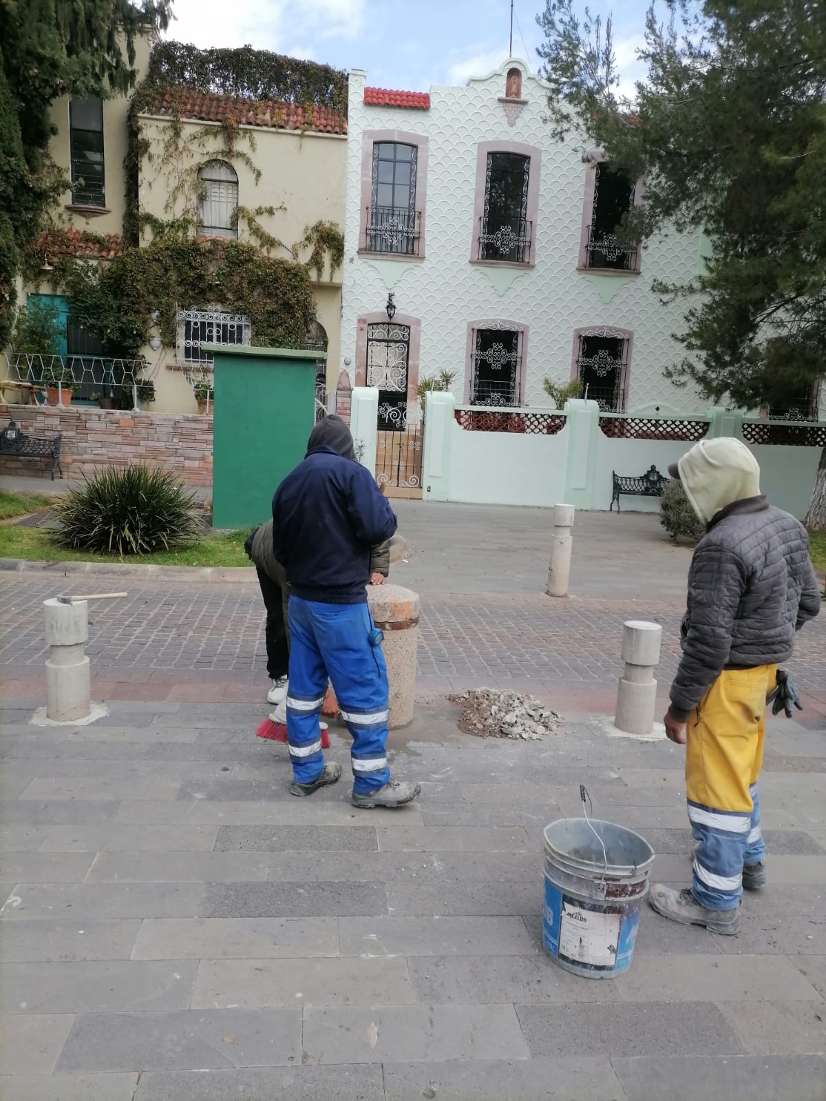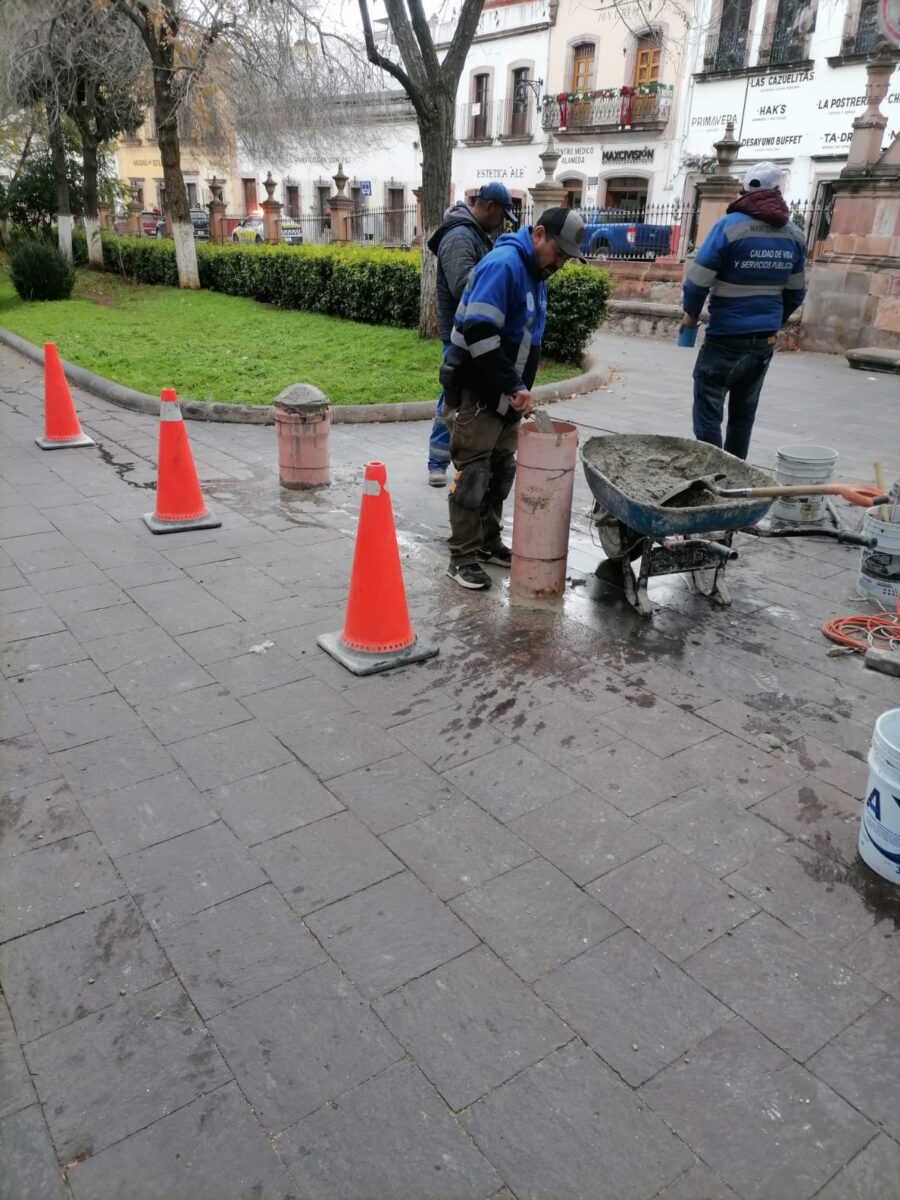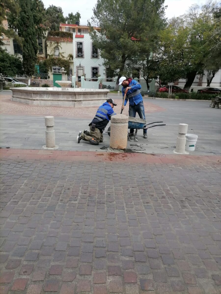 Después de varios días de haber sido vandalizadas, se realizaron trabjos de reparación de varios bolardos de concreto.