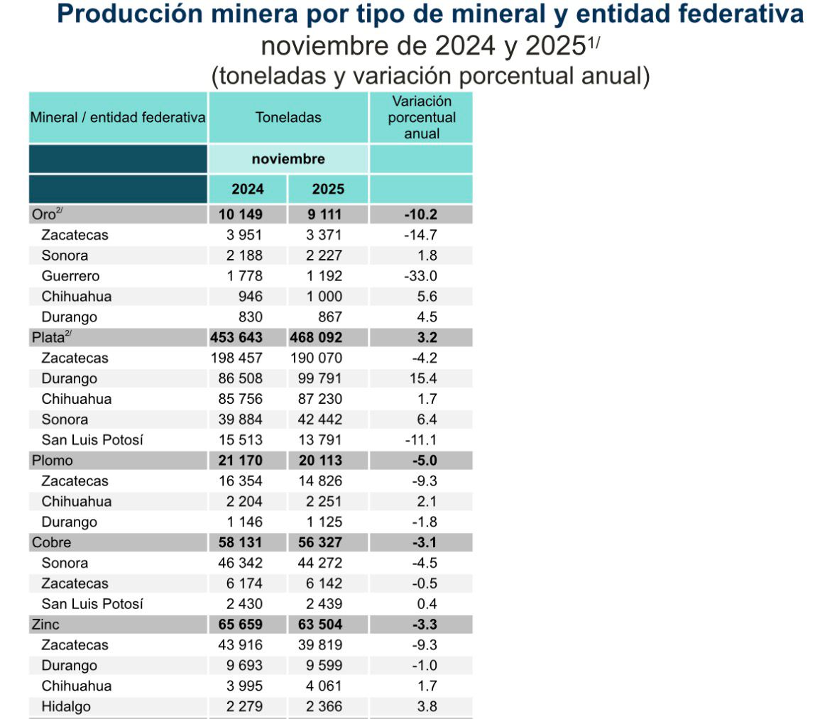 El estado de Zacatecas confirma su liderazgo minero en el país, al colocarse en primer lugar nacional en la producción de oro, plata, plomo y zinc, de acuerdo con la Estadística de la Industria Minerometalúrgica (EIMM), del Instituto Nacional de Estadística y Geografía (INEGI).