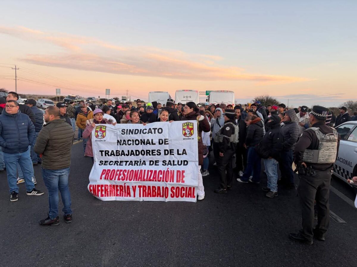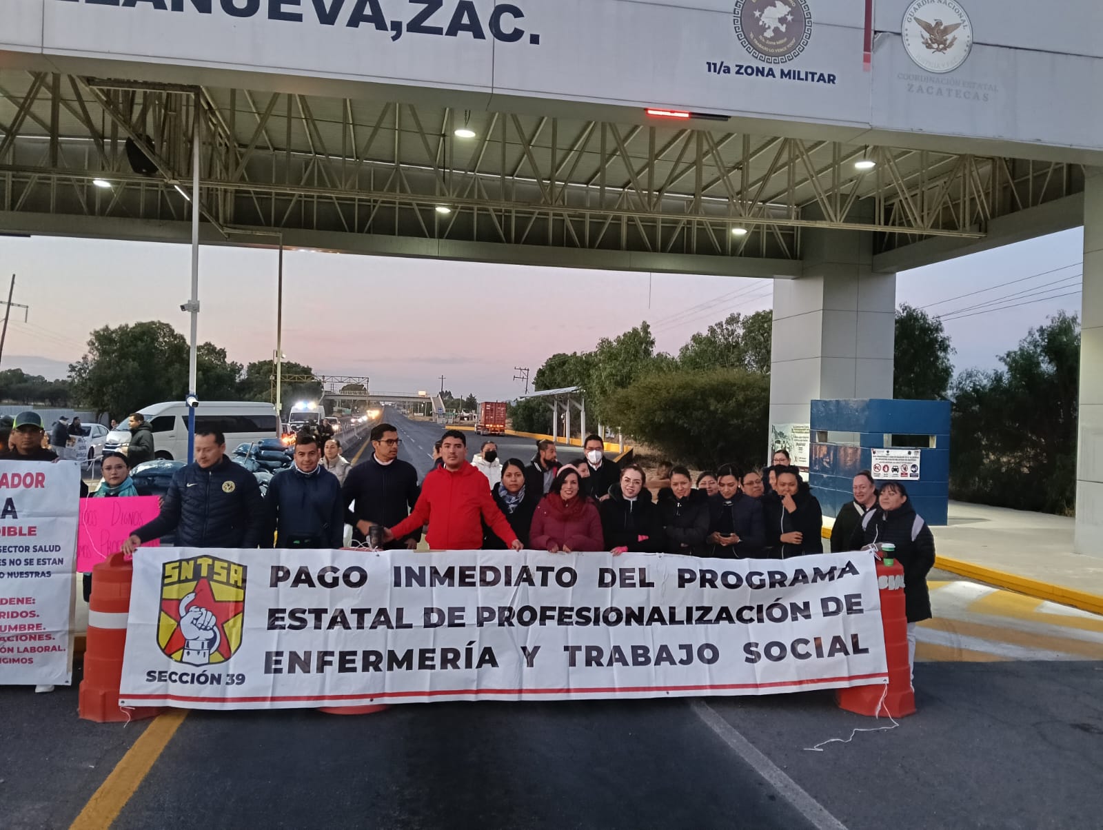ZACATECAS. – Desde las siete de la mañana de este martes, el Sindicato Nacional de Trabajadores de la Secretaría de Salud (SNTSA) sección 39, iniciaron tres bloqueos simultáneos en las carreteras federales de Zacatecas, como protesta para exigir el pago del programa de Profesionalización Estatal de Personal de Enfermería y Trabajo Social.