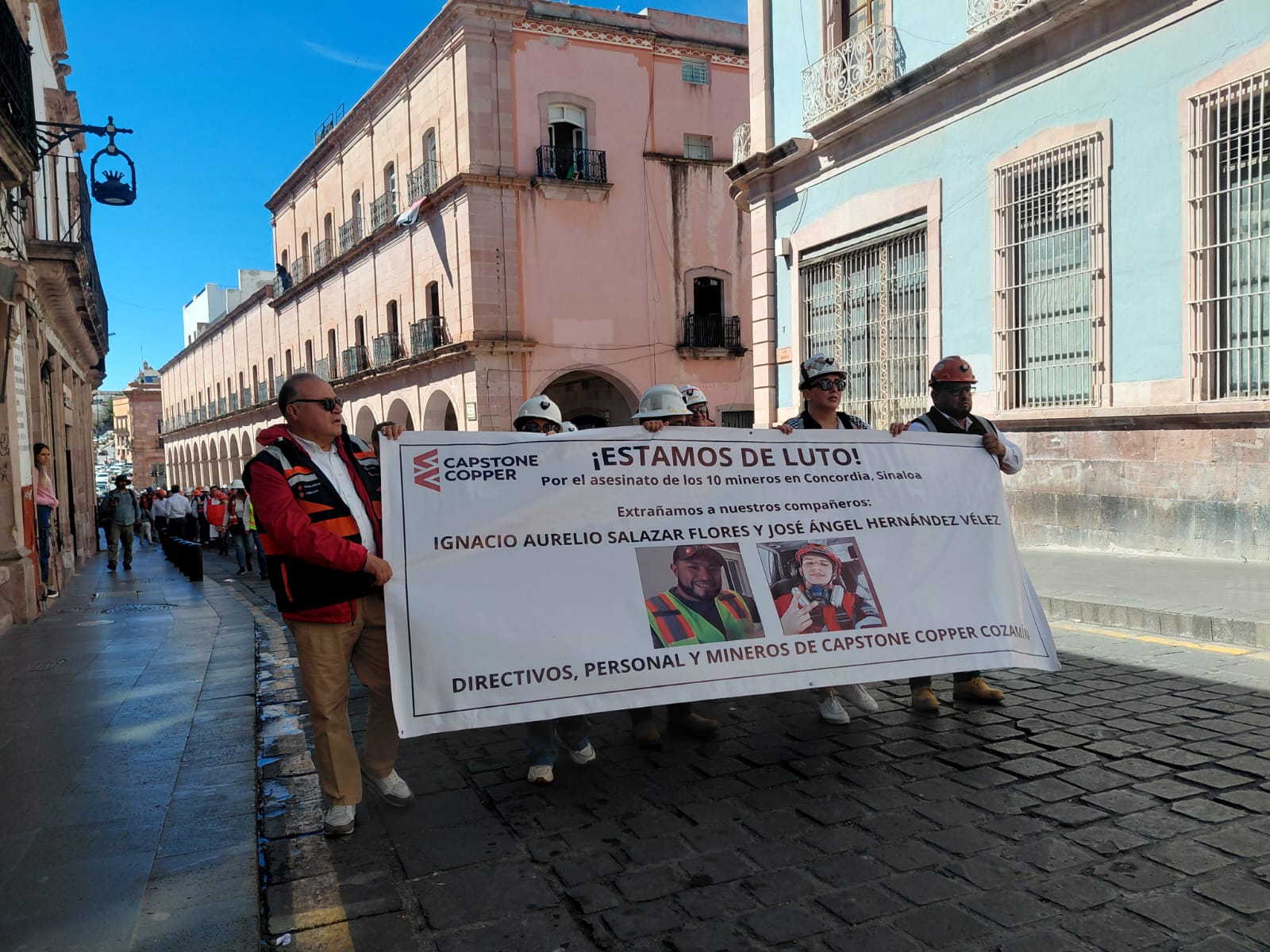 Marcha de mineros en Zacatecas, en memoria de sus compañeros asesinados y claman justicia a la presidenta Sheinbaum