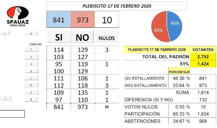 ZACATECAS.-Con 973 votos en contra, los integrantes del Sindicato de Personal Académico de la Universidad Autónoma de Zacatecas (SPAUAZ) dijeron no a la huelga en la Máxima Casa de Estudios del estado, con lo cual se acepta el preconvenio de huelga presentando por la administración central.