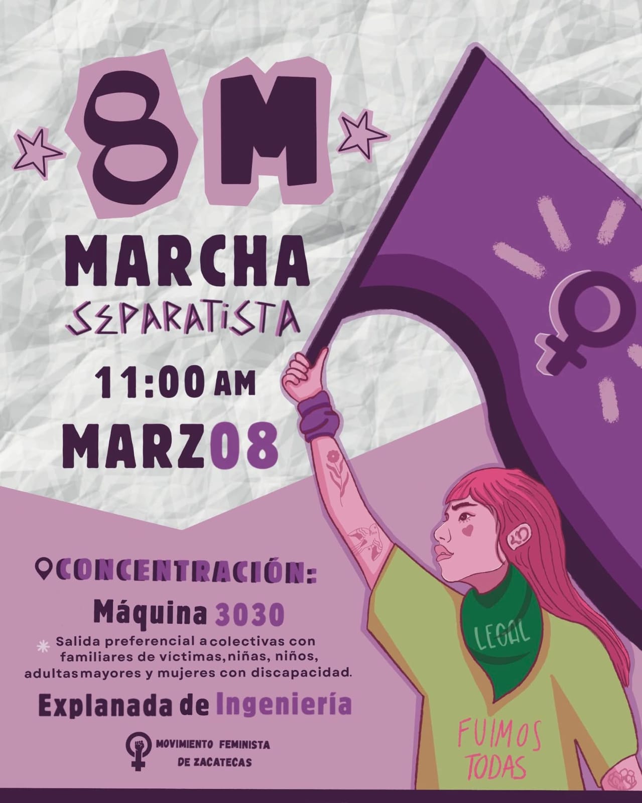 La marcha será el domingo 8 de marzo en punto de las 11 horas con dos puntos de salida, el primero en las inmediaciones de ingeniería de la UAZ y el segundo en la maquina 30-30 para colectivos de infancias y/o personas con discapacidad quienes se incorporan al contingente en la Avenida González Ortega, en este año se espera la participación de 50 organización.