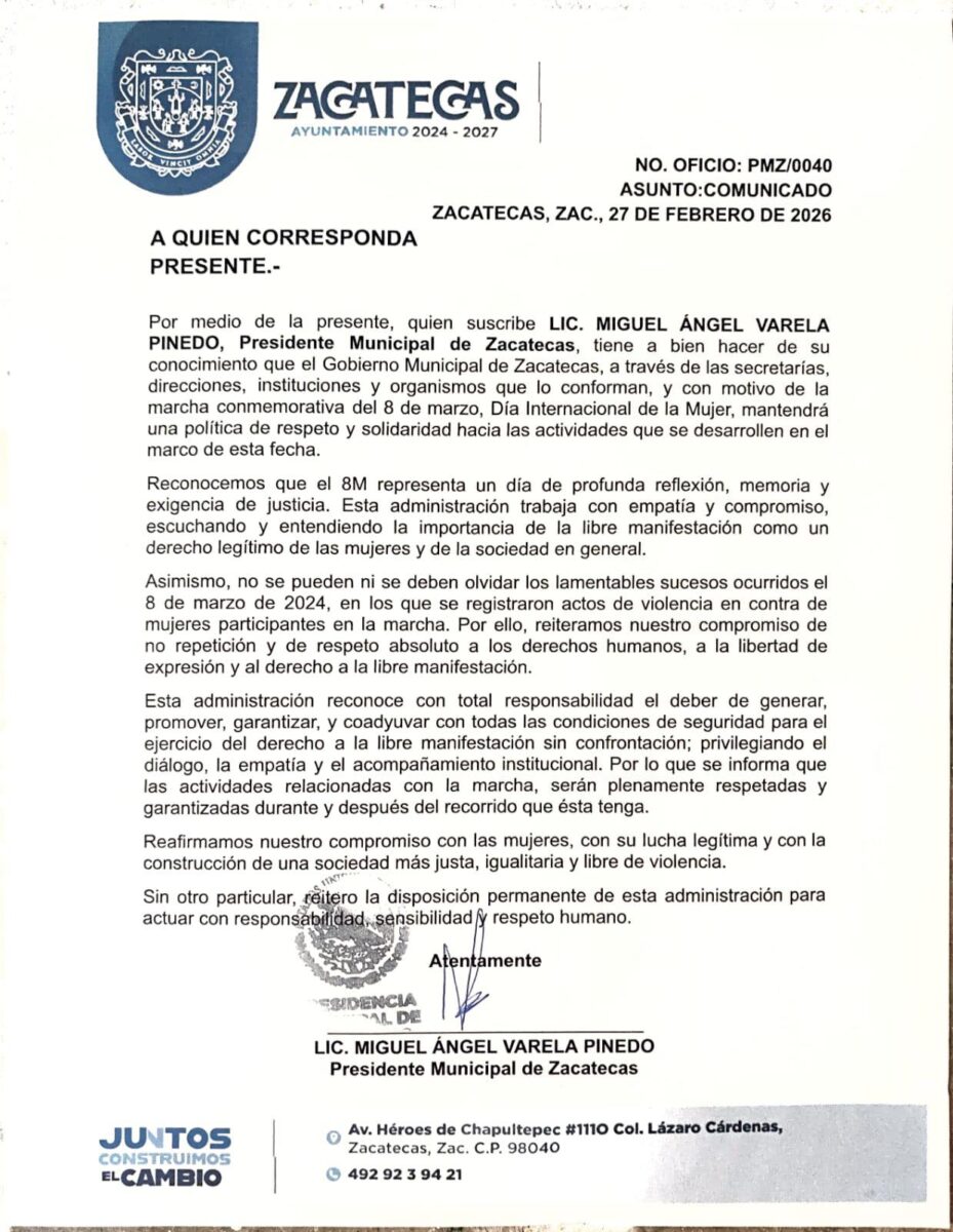 “En el marco del 8 de marzo, Día Internacional de la Mujer, el Gobierno Municipal de Zacatecas refrenda su compromiso absoluto con el respeto a los derechos humanos, la libre manifestación y la libertad de expresión”.