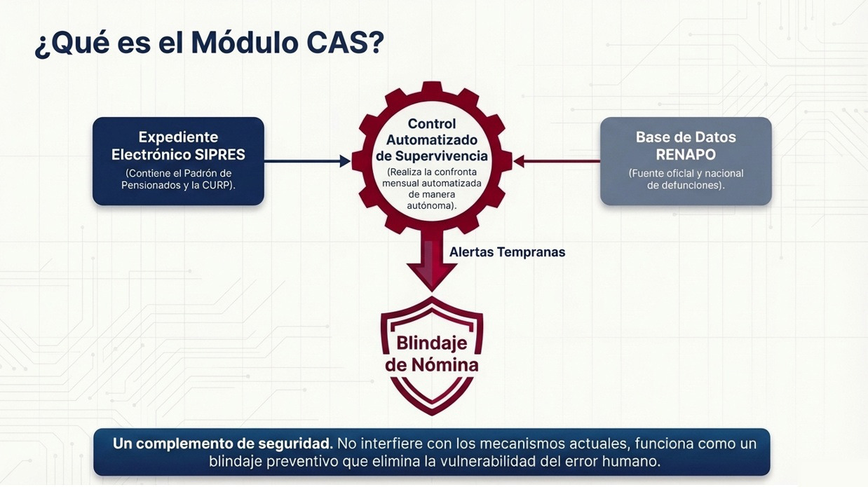 El CAS es un módulo de inteligencia de datos integrado al Sistema de Prestaciones (SIPRES), diseñado para realizar la comparación automatizada mensual del 100 por ciento de los registros contenidos en el expediente electrónico del Instituto, cuyo objetivo es lograr la validación mensual del total de las y los pensionados, mediante la confronta automatizada de la CURP contra las bases de datos oficiales del Registro Nacional de Población (RENAPO). Gracias a esto, se eleva el grado de seguridad de los servidores públicos.