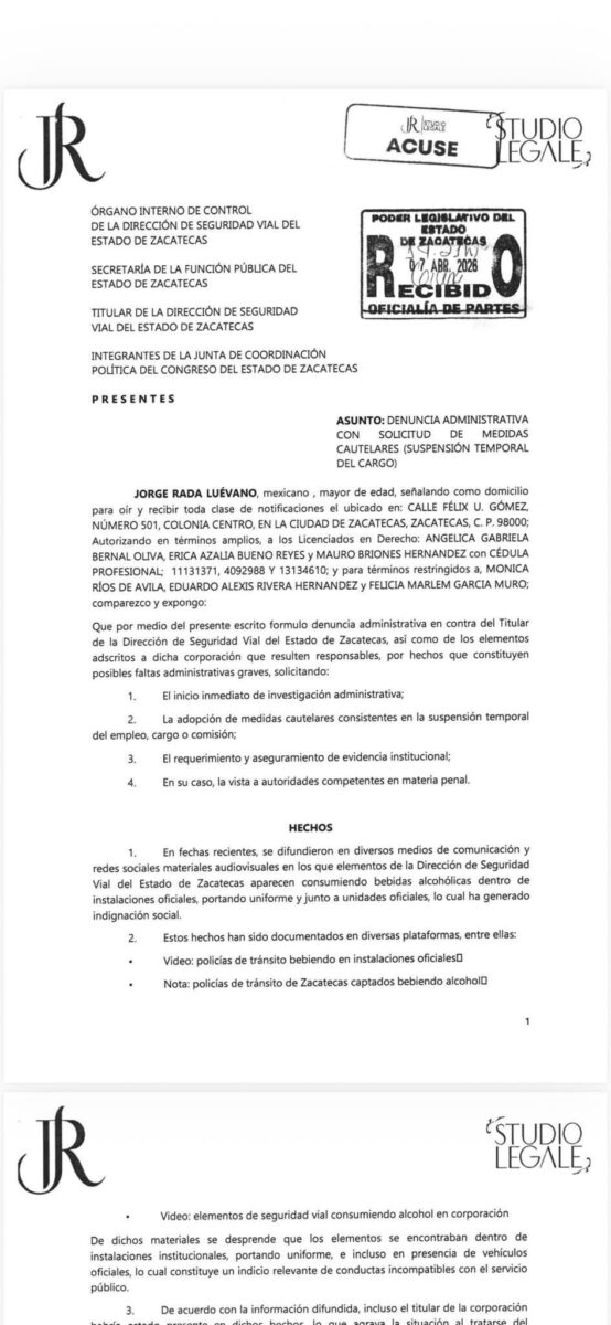 El abogado Jorge Rada Luévano destaca en el oficio recibido en la oficialía de partes del Congreso de Zacatecas, que demanda el inicio inmediato de una investigación administrativa, la suspensión temporal del empleo, cargo o comisión, el requerimiento y aseguramiento de evidencia institucional y, en su caso, la vista a autoridades competentes en materia penal.