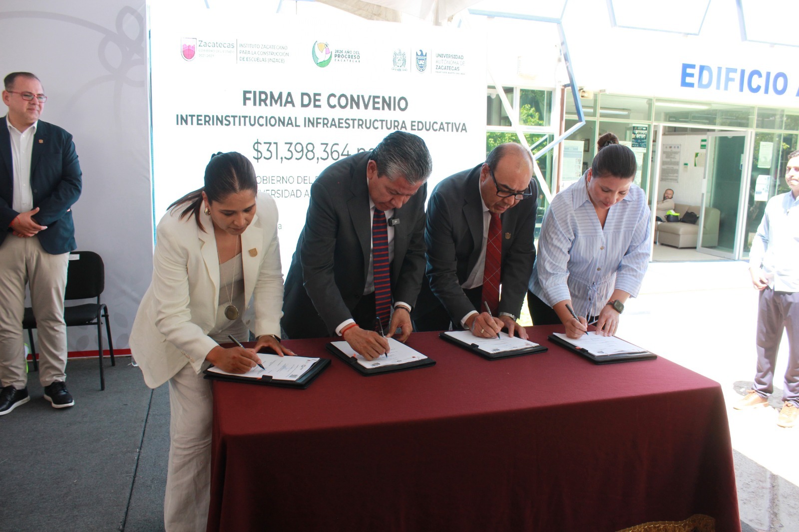 En la Unidad Académica de Odontología (UAO) de la Universidad Autónoma de Zacatecas (UAZ), se concretó la firma del convenio “Peso a Peso”, que consiste en una alianza estratégica que busca fortalecer, rehabilitar y ampliar la infraestructura educativa en los niveles básico, medio superior y superior de la institución.